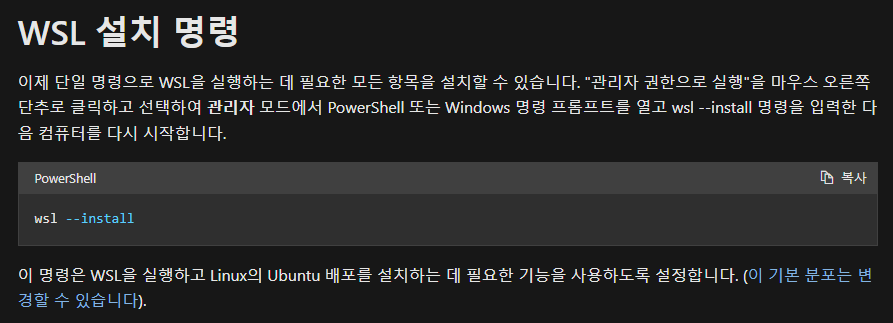 예전에는 직접 WSL 설치와 ubuntu 설치를 직접했는데 요즘에는 한번에 우분투까지 기본으로 설치가 된다.