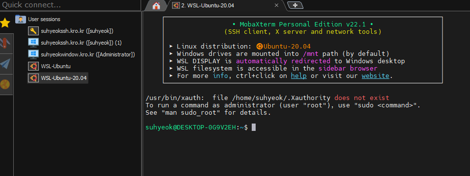 대부분 여기서 끝내지만. 나는 여기서 한가지 설정을 더해주었다. 내가 평소에 ssh를 쉽게 사용해주는 mobaxterm을 사용한다. 물론 putty를 대부분 사용하여 처음듣는 사람도 많을것이다. 하지만, 평소 RDP도 같이 사용하는 나에게 mobaxterm을 사용하는것은 매우 편리하였다.