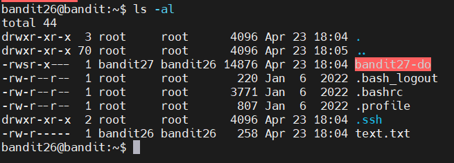 수상한 bandit27-do라는 파일에 권한이 bandit27과 bandit26이 있다. uid 바이너리 파일 같다.