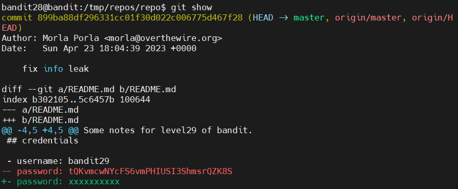 bandit29의 비밀번호는 "tQKvmcwNYcFS6vmPHIUSI3ShmsrQZK8S"이다.